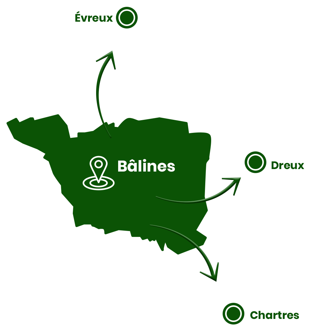 Située à Bâlines en Normandie, Terre & Bois intervient dans un rayon d'une cinquantaine de kilomètres, dans les départements de l'Eure, de l'Eure-et-Loir et des Yvelines. Retrouvez-nous dans des communes telles que Chartres, Dreux ou encore Évreux.